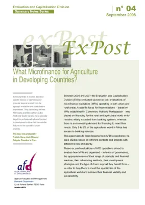 Between 2005 and 2007 the Evaluation and Capitalisation Division (EVA) conducted several ex post evaluations of microfinance institutions (MFIs) operating in both urban and rural areas. A specific foc...