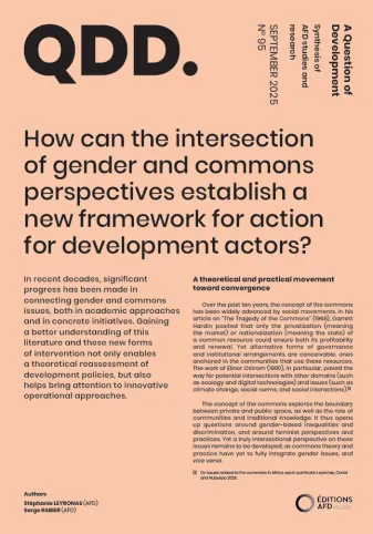 In recent decades, significant progress has been made in connecting gender and commons issues, both in academic approaches and in concrete initiatives. Gaining a better understanding of this literature and these new forms of intervention not only enables a theoretical reassessment of development policies, but also helps bring attention to innovative operational approaches.