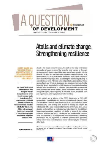 At just a few meters above the waves, the atolls or low-lying coral islands surrounding a lagoon are one of the areas the most exposed to the many consequences of climate change (rising water levels, lagoon erosion, but also ocean acidification and land salinization, changes in rainfall patterns, etc.). Most of these 400 or so coral islands are located in the Pacific: almost 80 in the Tuamotu Archipelago alone, constituting the world‘s largest group of such islands, in French Polynesia, while independent English-speaking States, such as Tuvalu and Kiribati, in Micronesia, are exclusively made up of atolls. Population density remains highly variable from one of these islands to another, but most have been inhabited for centuries. Their populations are among the most resilient in the world, within a natural environment which they have managed to exploit, while respecting it, but which is now threatened. Their past experience is today highly instructive for the future.