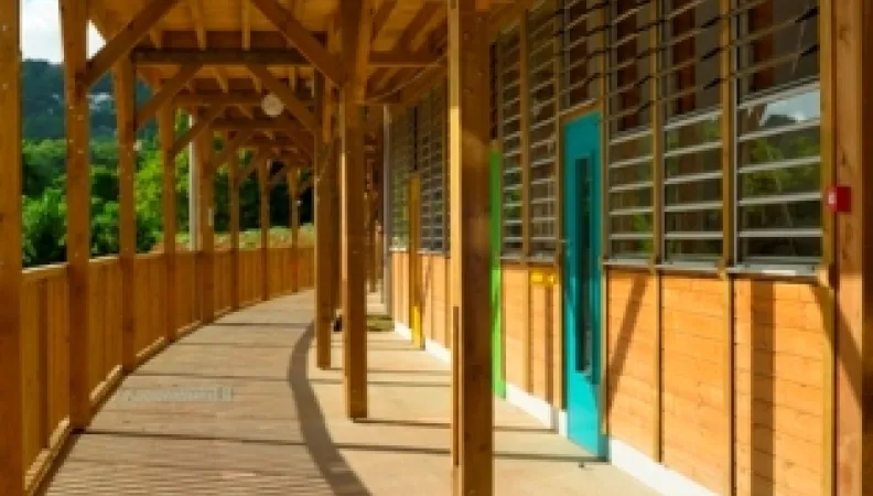 Construite en bois et sur des appuis parasismiques, la nouvelle école « Moulin à vent » a fait l’objet d’une démarche HQE (Haute Qualité Environnementale). Cet équipement de proximité, situé hors du centre bourg a permis d’améliorer les conditions de sécurité pour l’accueil des enfants et le travail de l’équipe enseignante. L’école comprend un espace d’accueil, 10 salles de classe, des lieux de repos, des lieux d’éducation physique et d’évolution, des lieux pour les récréations, des lieux de restauration pour le déjeuner, les goûters, des salles de propreté, des locaux pour adultes, une garderie, des zones de rangement ou de stockage de matériel.