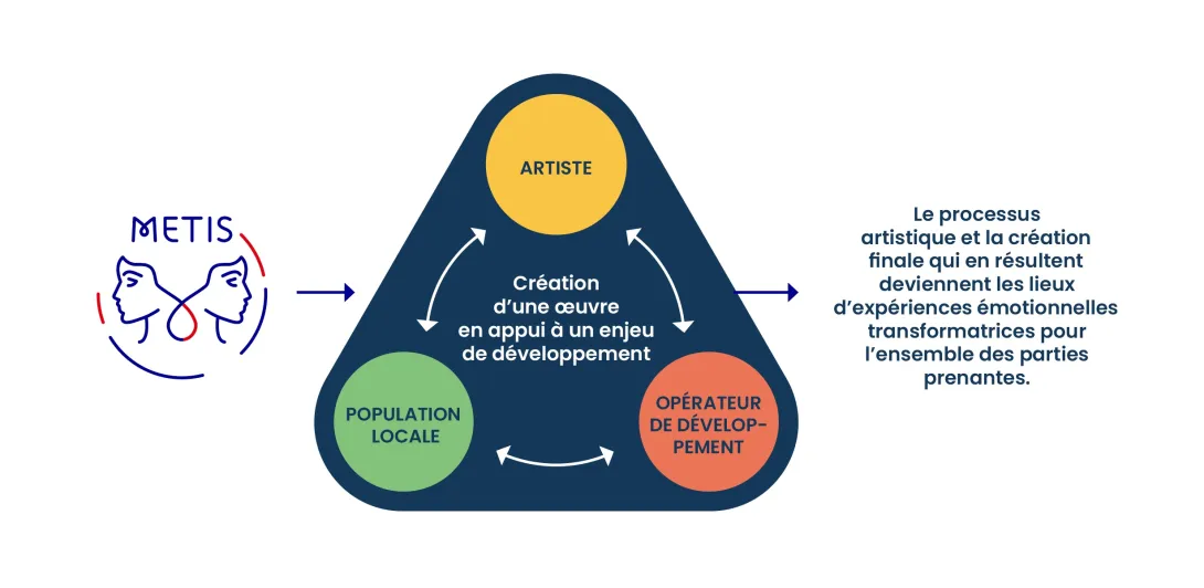 Créé en 2021, le fonds Metis Arts et développement est hébergé au sein de l’AFD. Visant l’atteinte des Objectifs de développement durable (ODD), il finance des initiatives réunissant un artiste, un opérateur « classique » de développement et une population locale sur un territoire. Leur rencontre autour d’un enjeu de développement qui les concerne tous, le processus créatif qui les réunit et la création artistique finale qui résulte du projet financé donnent lieu à des expériences transformatrices pour l’ensemble des parties prenantes. Metis se veut passeur d’émotions, porteur de transformations.