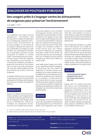 Les sargasses, des algues brunes pélagiques, provoquent des échouements massifs en Martinique et en Guadeloupe, impactant l’économie locale, l’environnement et la santé publique. Le coût élevé de leur gestion dépasse les ressources des collectivités, et malgré une aide de l’État, une contribution financière de la population pourrait s’avérer nécessaire. Le présent article, issu d’une étude menée dans le cadre du projet CESAR porté par le LC2S (Laboratoire caribéen des sciences sociales, actuellement PHEEAC), évalue le consentement à payer (CAP) des résidents, des entreprises et des touristes.