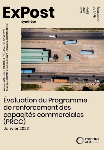 Commanditée par l’AFD, la DG Trésor du ministère de l’Economie, des Finances, de la Souveraineté Industrielle et Numérique et la Direction générale de la Mondialisation du ministère de l’Europe et des Affaires étrangère, l’évaluation du Programme de Renforcement des Capacités Commerciales (PRCC) couvre ses générations 3 à 5 du PRCC (2010-2019), soit 51 projets financés dans plus de 60 pays (81 M€ engagés). Le PRCC vise à promouvoir les échanges commerciaux des pays en développement et à renforcer leurs capacités commerciales et productives.