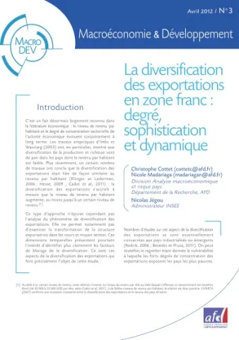 Nombre d‘études sur la diversification des exportations sujet sont essentiellement consacrées aux pays industrialisés ou émergents, un fait regrettable compte tenu de la vulnérabilité à laquelle les forts degrés de concentration des exportations exposent les pays les plus pauvres. Cet article se concentre donc sur les pays de la zone franc, un contexte rarement étudié jusque lors, et qui révèle combien les bases exportatrices des pays, même les plus pauvres, se renouvellent et s‘enrichissent parfois de nouveaux biens. Après une revue rapide des évolutions récentes de la littérature sur le sujet, la deuxième partie de cet article propose trois indicateurs de diversification des exportations. La troisième partie est consacrée au choix et au traitement des données, qui se révèlent particulièrement délicats en zone franc. Enfin, la quatrième partie est consacrée à la présentation des résultats de cette étude.