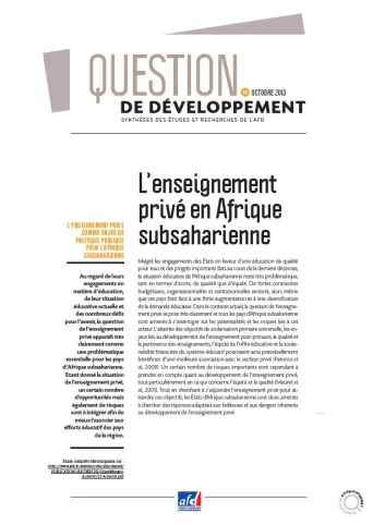 Au regard des engagements des États en matière d‘éducation, de leur situation éducative actuelle et de nombreux défis pour l’avenir, la question de l’enseignement privé constitue un enjeu essentiel pour l’Afrique subsaharienne. L’étude ici synthétisée propose une analyse du fonctionnement de l’enseignement privé dans la région (son offre et sa demande, son encadrement, ses financements et ses réalisations). L’auteur montre à quel point il est important de mieux l’encadrer et de l’inciter à améliorer l'accès, la qualité et l'équité de l'éducation dans la région.