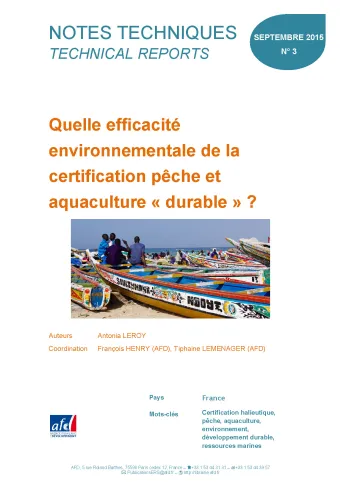 Face à la dégradation environnementale des océans et à la montée en puissance des systèmes de certification « durable » dans les secteurs des pêches et de l’aquaculture, représentant aujourd‘hui 13% des produits halieutiques vendus, l’analyse ici menée vient interroger l’efficacité environnementale affichée par les tenants de la certification. Elle se propose plus spécifiquement de cerner la réalité des processus de certification afin de discuter des enjeux sous-jacents à l’analyse de leur efficacité environnementale. C‘est en effet en connaissance de ces enjeux qu’il devient alors possible de réfléchir au rôle des acteurs impliqués et notamment dans notre cas à celui des bailleurs de fonds souhaitant appuyer une gestion plus environnementale des océans.